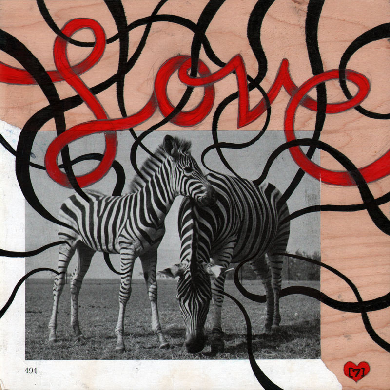 Original collage art, acrylic, and pencil on wood panel. Mounting hole drilled in back for easy hanging. Approximately 8" square.