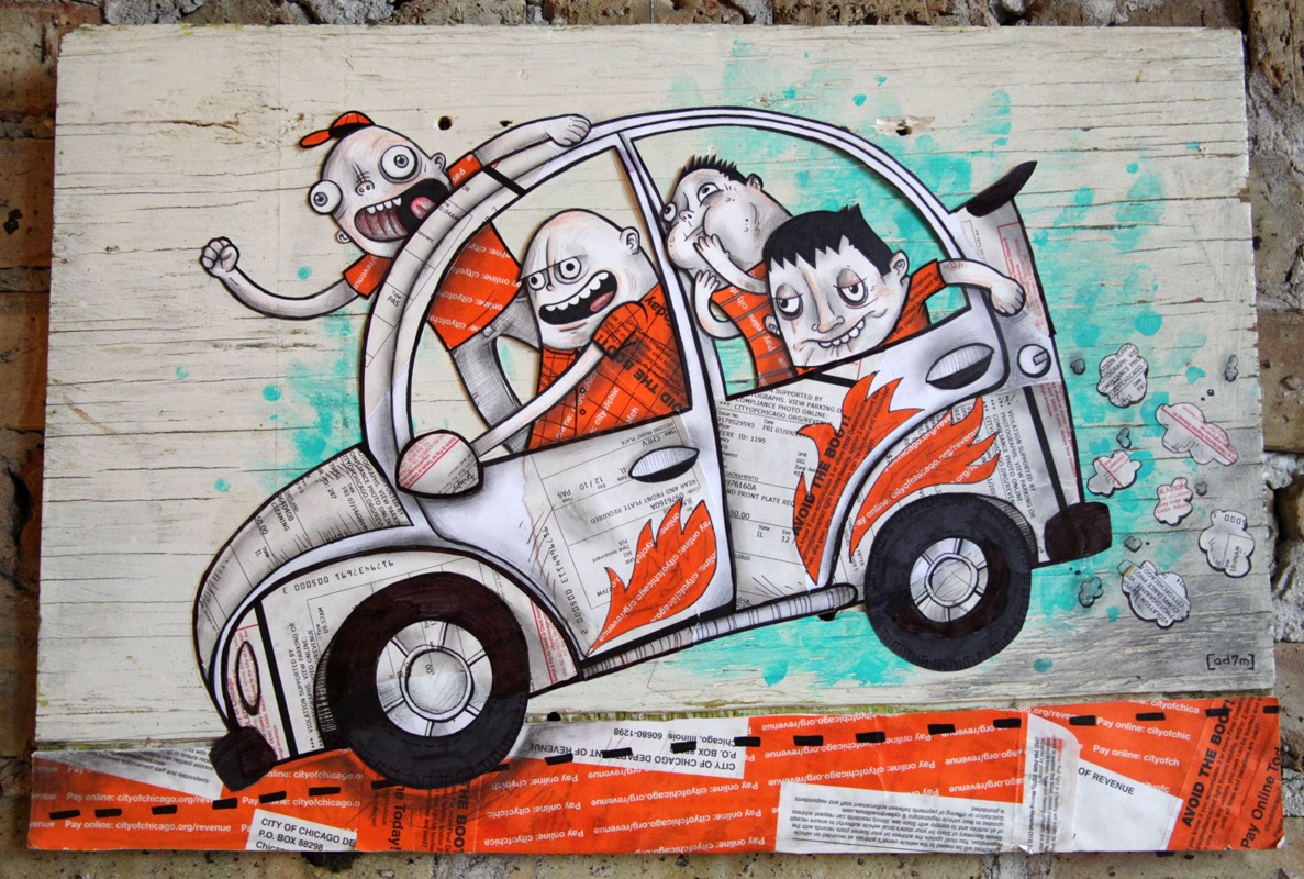 Original cut-papter illustration made of Chicago parking tickets.